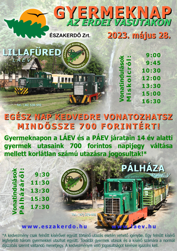 A lillafüredi és a pálházi erdei vasutak idén is kedvezményes utazási lehetőséggel várják gyermek utasaikat a május 28-i Gyermeknapon. A 14 év alatti gyermek utasok e napon 700 forintos napijegy váltása mellett korlátlat számú utazásra jogosultak a menetrend szerinti járatokon.