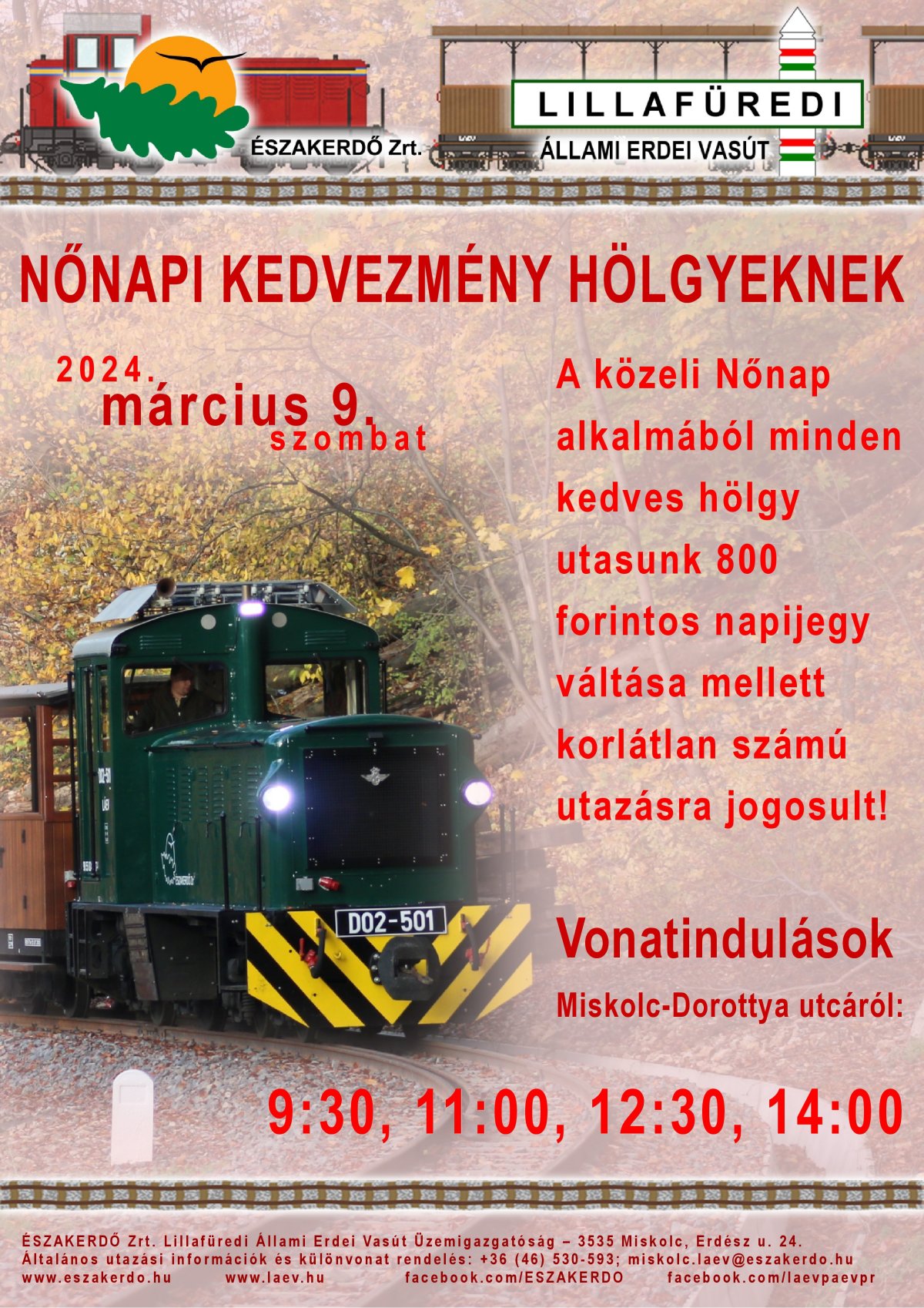 A közeli nőnap alkalmából 2023. március 11-én szombaton minden kedves Hölgy utasát kedvezményes utazási lehetőséggel várja a Lillafüredi Állami Erdei Vasút. A menetrend szerinti járatok számukra 700 forintos napijegy váltása mellett korlátlan számban igénybe vehetők. A LÁEV téli kínálata szerint napi négy járatpár szolgálja az utasokat, az aktuális menetrend elérhető a társaság honlapján.