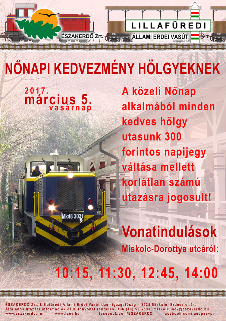 A közeli nőnap alkalmából, 2017. március 5-én, vasárnap minden kedves hölgy utasunk 300 forintos napijegy váltása mellett korlátlan számú utazásra jogosult a Lillafüredi Állami Erdei Vasút menetrend szerinti járatain.